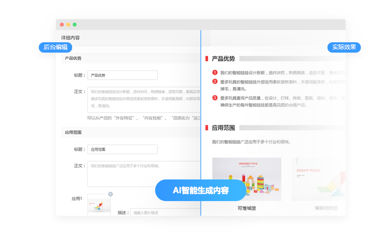 无需专业技术、文案知识及设计基础,仅需回答几个简单问题,即可轻松一键生成,有原创内容的高质量企业官网。操作简单,任意布局,一次编辑,多设备适应;无需代码,自由拖拽,不会技术,你也可以!( PC + 手机 + 微信网站 + 小程序 + APP,五站合一 )